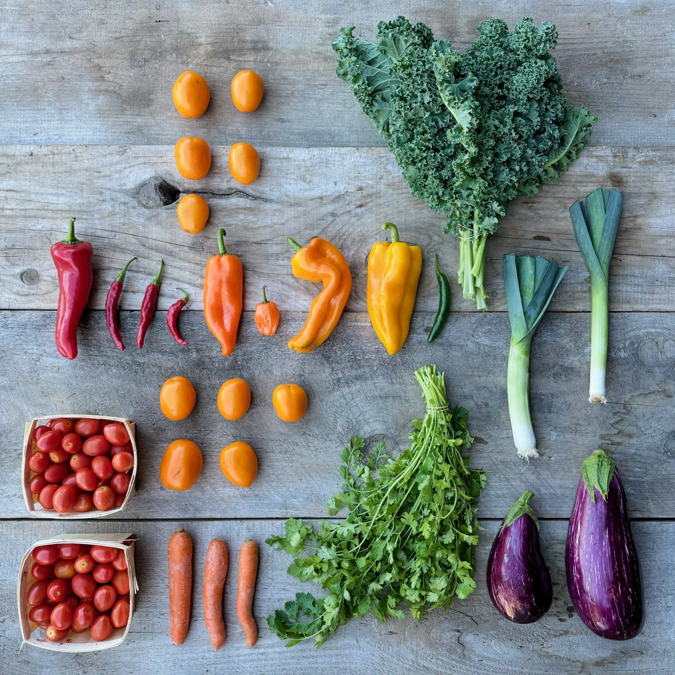 CHERRY TOMATOES - ROMA TOMATOES - CARMENS PEPPERS - EGGPLANT - CILANTRO - LEEKS - CARROTS - HOT PEPPER MEDLEY (CAYENNE, SERANO, HABANERO) - KALE