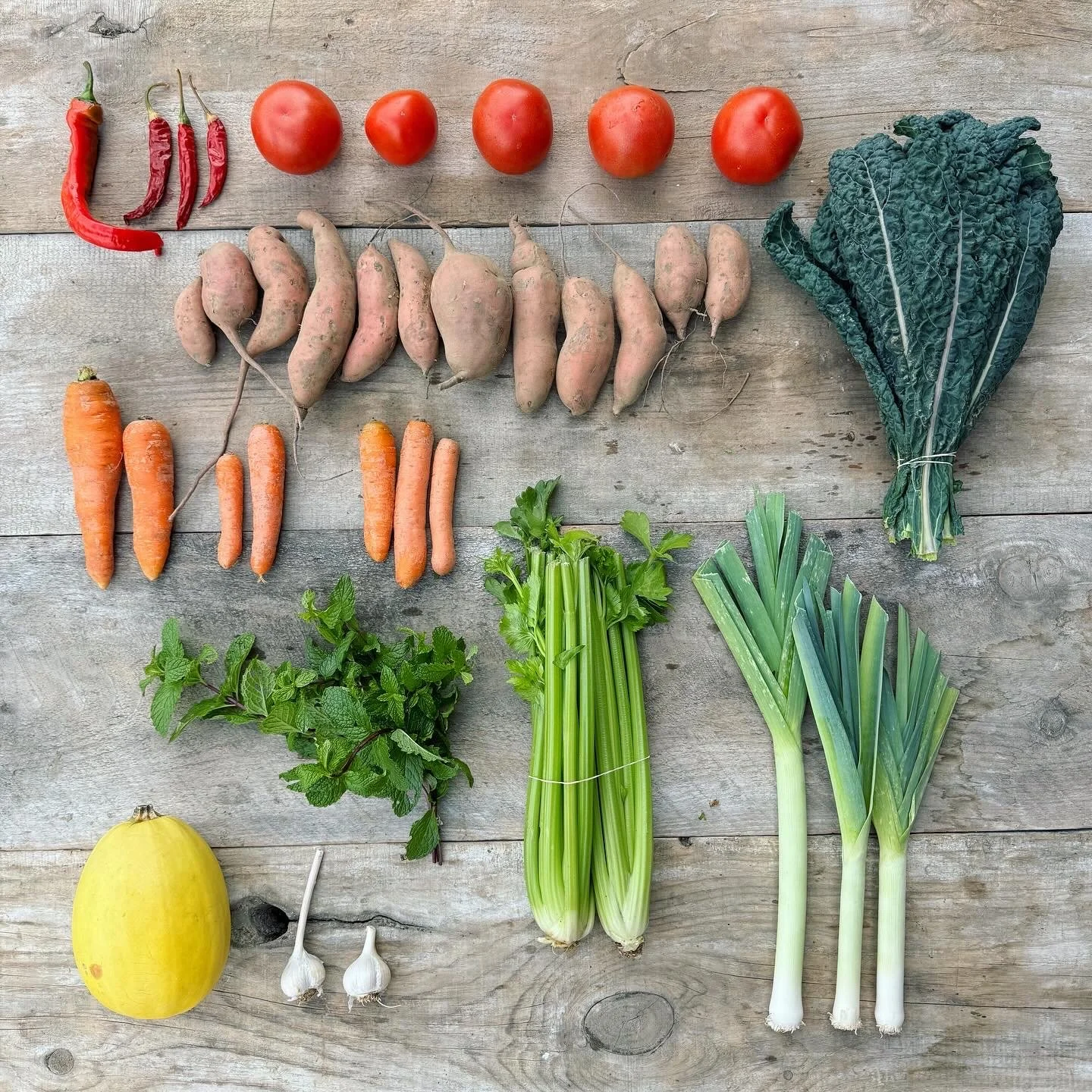 RED CLASSIC SLICING TOMATOES! - SPAGHETTI SQUASH - MINT - KALE - LEEKS - SWEET POTATOES - CELERY - CARROTS - DRIED CAYENNE PEPS - GARLIC