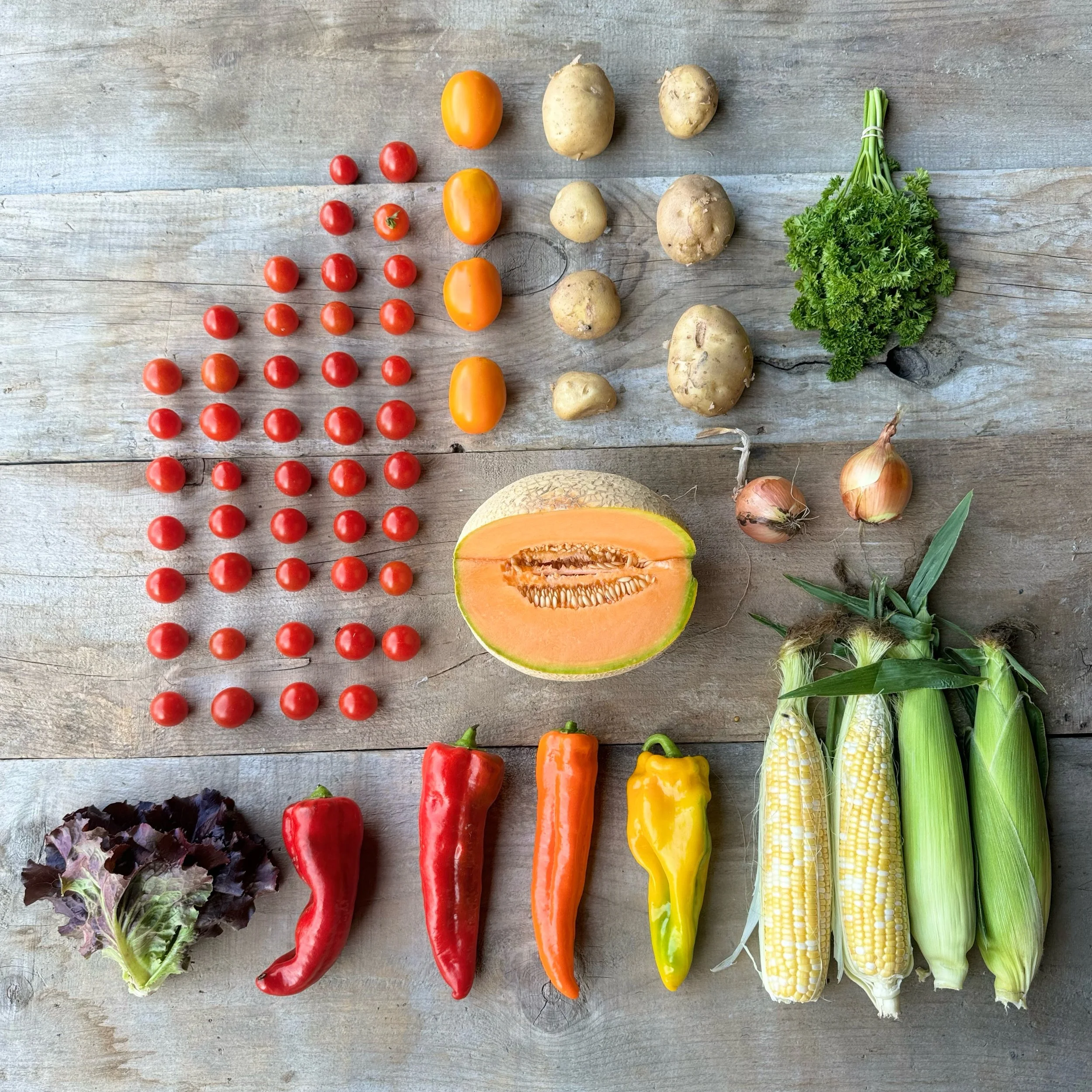 CARMEN PEPPERS GALORE - CHERRY TOMATOES - GOLDEN PLUM TOMATOES - CURLEY PARSLEY - POTATOES! - CORN - MELON - LETTUCE - ONIONS -